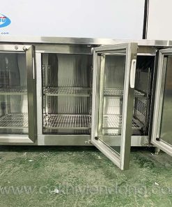 - Phần chân bàn lạnh công nghiệp chịu lực tốt, được đặt cố định giúp tránh xô lệch khi thao tác liên tục và có khả năng điều chỉnh chiều cao linh hoạt.